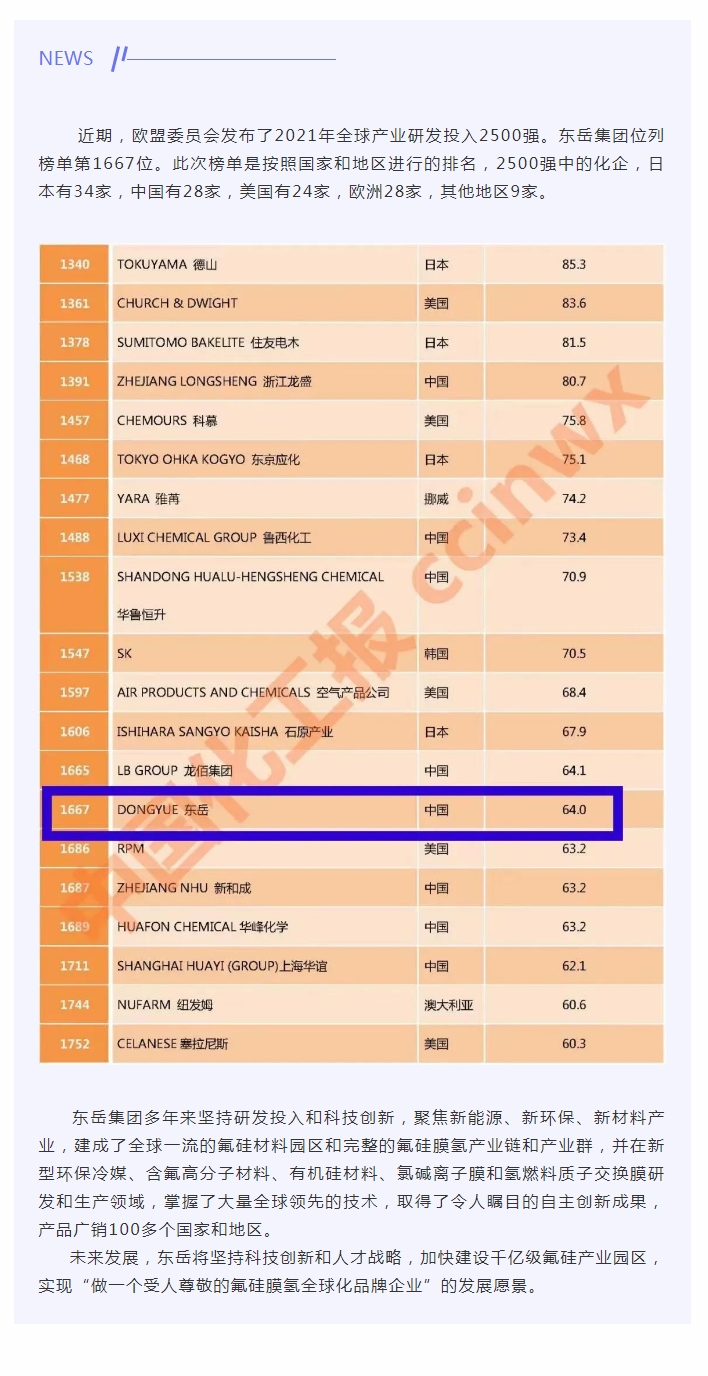 東岳集團(tuán)入列全球研發(fā)投入榜