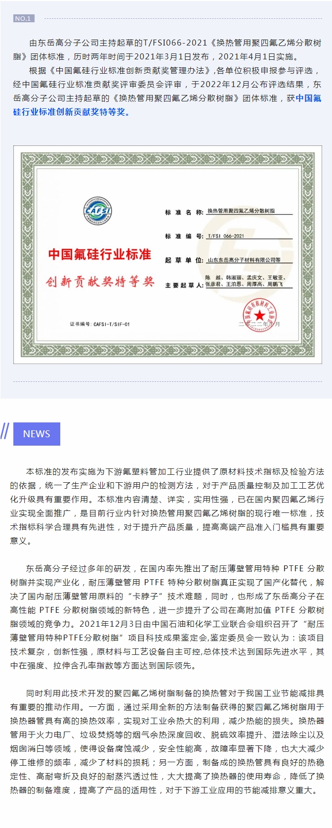 東岳高分子公司獲中國(guó)氟硅行業(yè)標(biāo)準(zhǔn)創(chuàng)新貢獻(xiàn)獎(jiǎng)