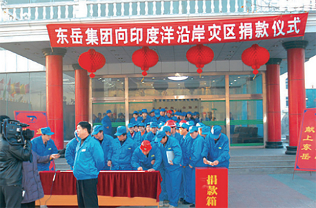 多年來,東岳不僅為地方財政收入做出了重要貢獻(xiàn)并且積極從事各類公益事業(yè),集團(tuán)黨委積極參與“慈善一日捐”,在新冠疫情、“利奇馬”臺風(fēng)、印度洋海嘯、汶川大地震等重大自然災(zāi)害面前,東岳都積極捐款救災(zāi)。幾年來,公司累計各類社會公益捐款近